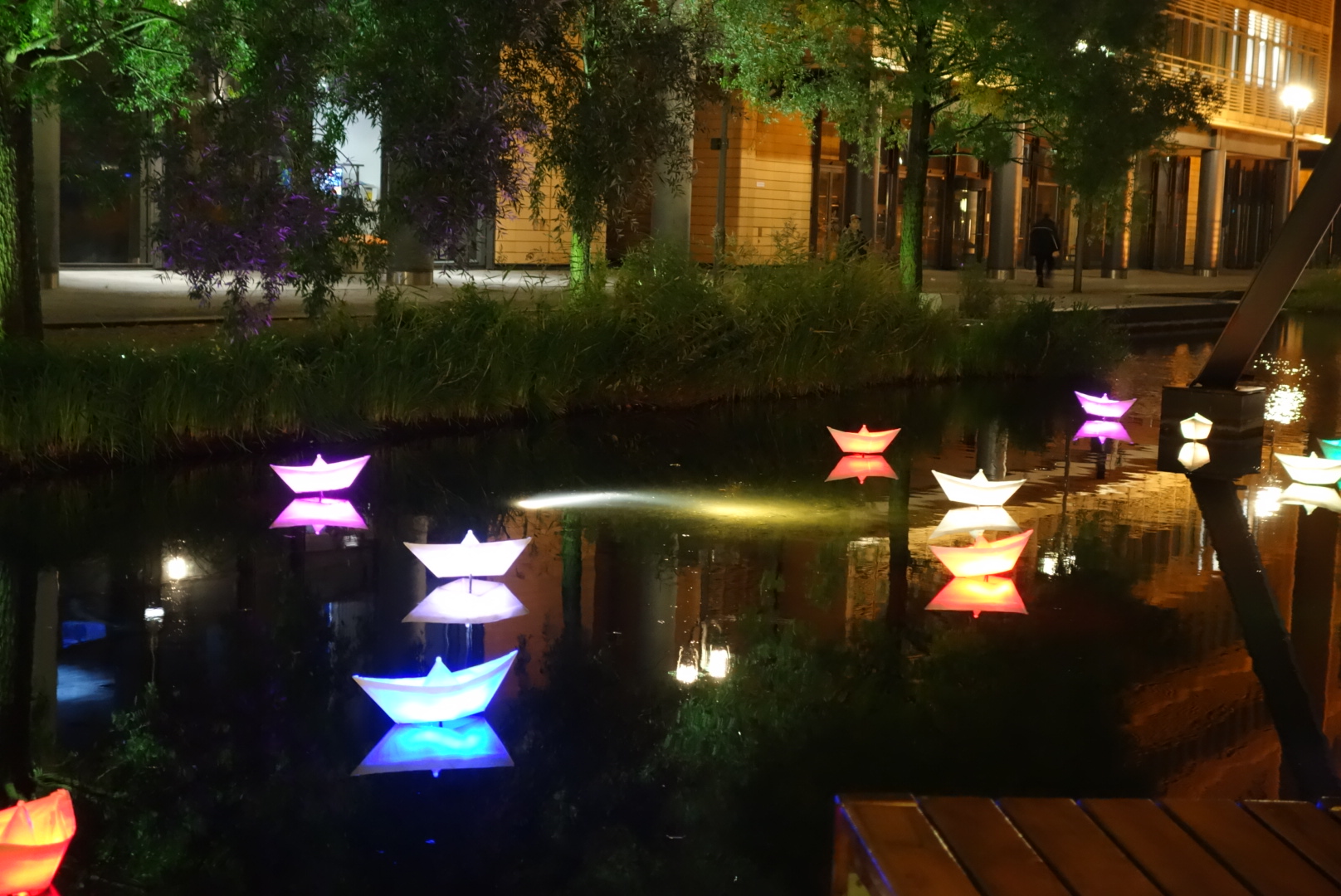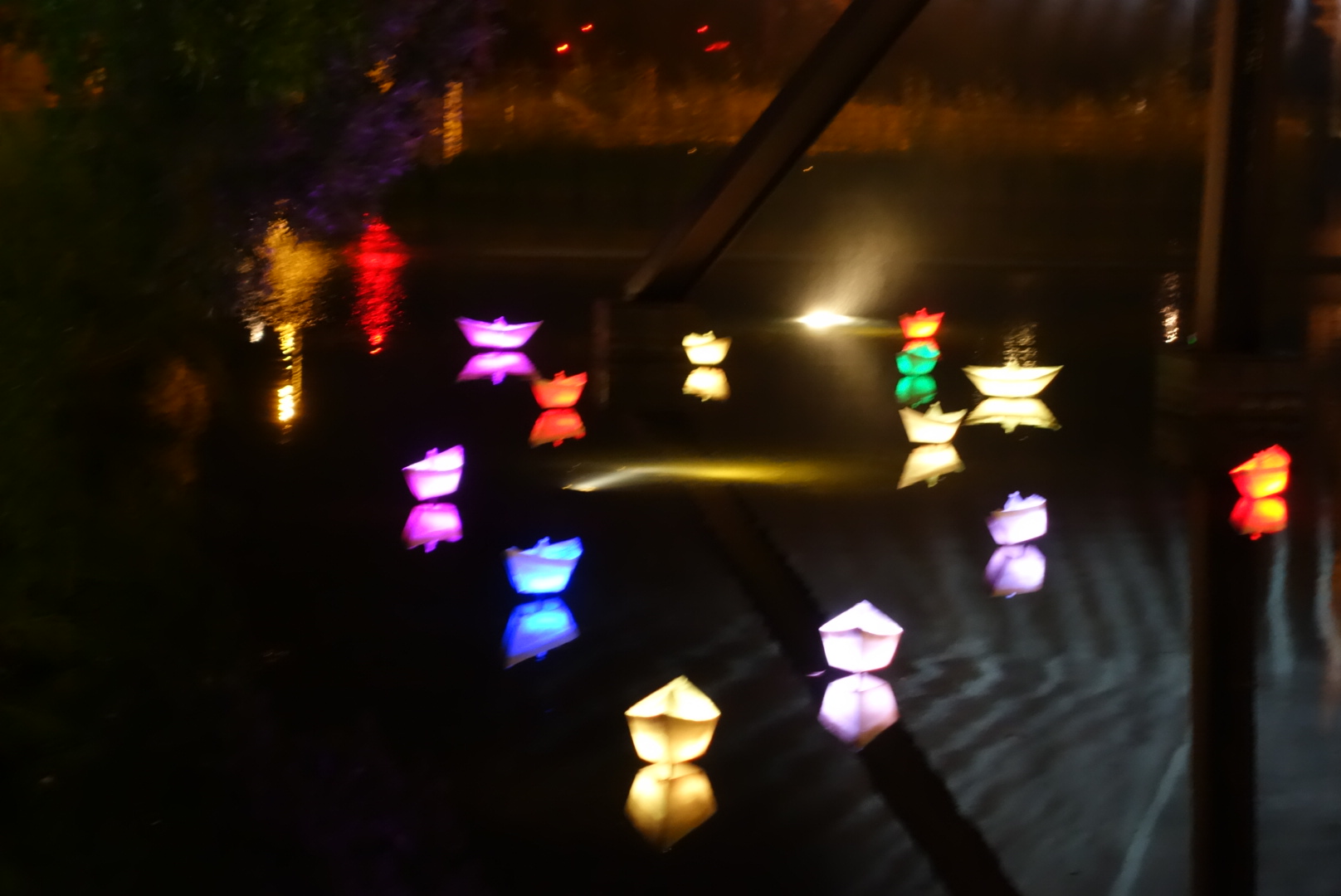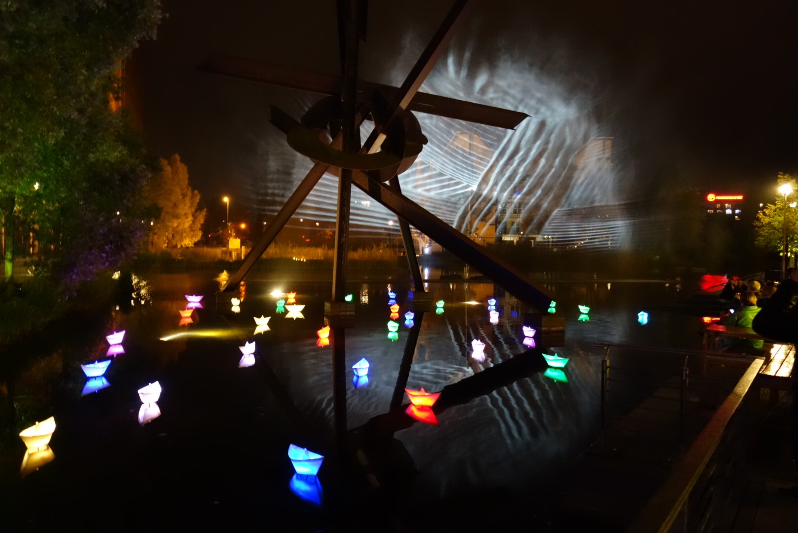 Als letztes möchte ich noch eine Lichtinstallation zeigen, die mich auch sehr beeindruckt hat: Wasser mit kleinen bunten Booten und darüber in Nebel projizierte Bilder. Ich kam aus dem Staunen gar nicht mehr raus. Davon hier auch noch mal ein paar Fotos, die ich gemacht habe.
